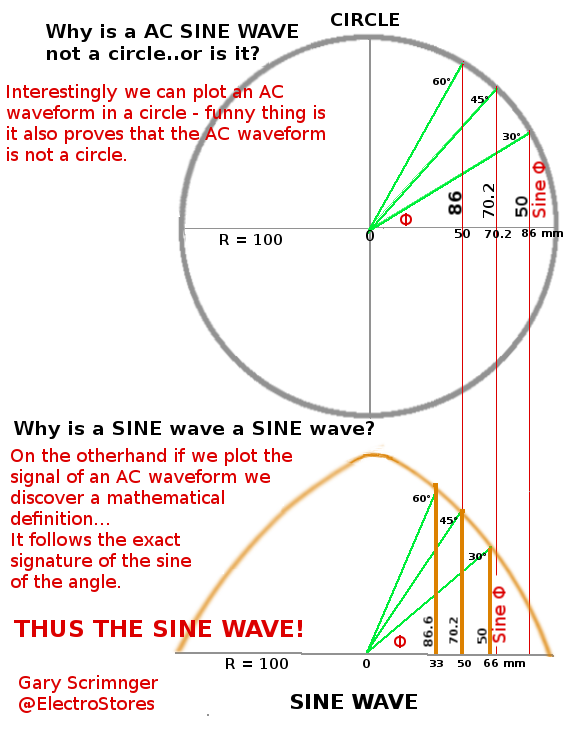 This brings us to a question I should have asked a long time ago as an electrician...."Why is the AC waveform called a "sine wave?". Nothing else is called a sine wave. Why not a "cos" wave? Even more so:-"Why is the AC wave form is always drawn so "oval" - yet the rotation machine is a perfect "circle". Can't no-one draw a perfect circle anymore?" Lets first answer the question of the name "sine wave?" The short answer is: In a circle one would expect at 45 degrees we intersect down to the X axis at half the radius since its half of the 90 degrees, but we intersect at 70.7% of radius. This means, in a circle we honour the degrees first - but what if we honour the X axis interval first - in other words we draw the X axis in equal segments of degrees. If we then go to X - halfway mark (50% radius) we will find the Y- vector to be at 45 degrees. And the X 30 Degrees will be 50% of radius. The result of this figure is a flat curve (oval) compared to a circle.